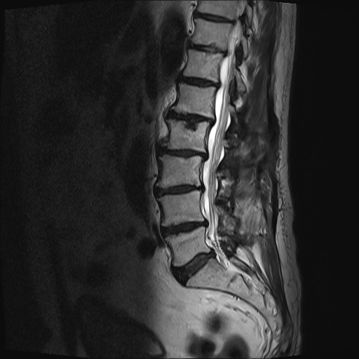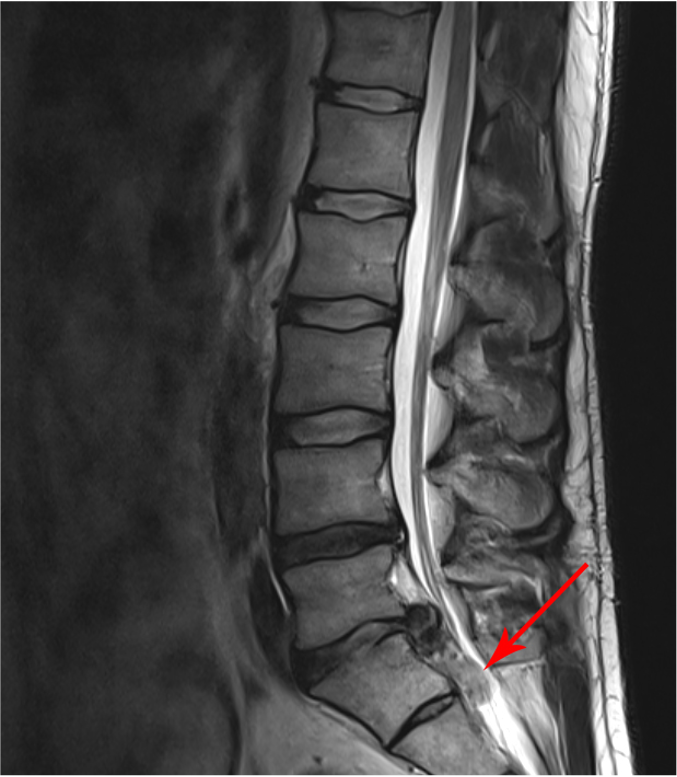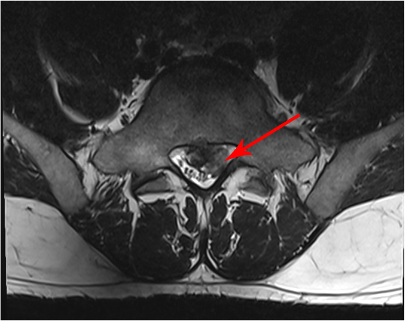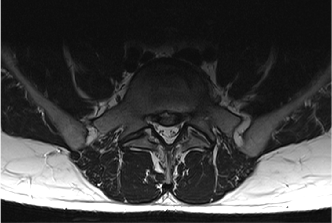 Die MRT-Bilder zeigen einen 27 jähriger Patienten mit plötzlichen Rückenschmerzen mit Ausstrahlung ins linke Bein, über die Wade bis in die äußeren Zehen. Vor allem im Fuss besteht ein Taubheitsgefühl.