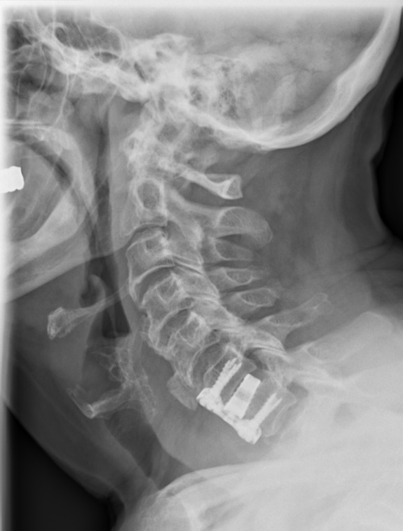 Im 3. Bild sieht man die Schrauben, Platte und Cage Stabilisierung in der Höhe HWK 6/7 zur Entlastung und Stabilisierung des Spinalkanals.