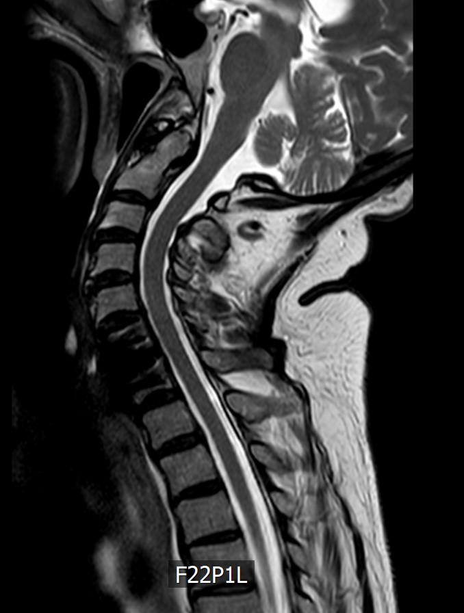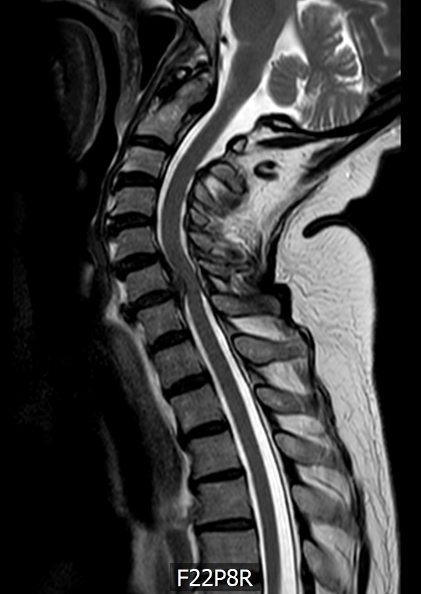 Das MRT zeigt eine 78 jährige Patientin. Schon seit Jahren klagt sie immer wieder über Nackenschmerzen. Seit einem halben Jahr hat sie ein Taubheitsgefühl in beiden Händen. Die Feinmotorik hat deutlich nachgelassen. So ist das Schliessen eines Hemdknopfes und dass Sticken nicht mehr möglich. Das Schriftbild ist kaum noch leserlich. Das Gehen ist sehr unsicher, vor allem bei Dunkelheit und auf unbekanntem Gelände.